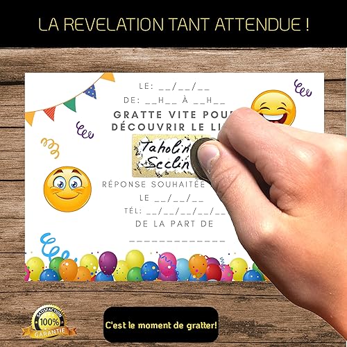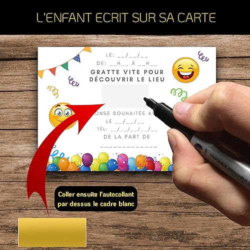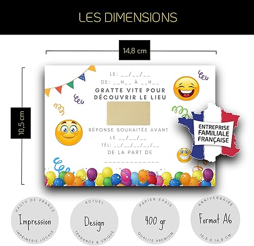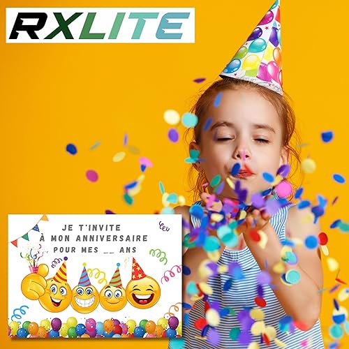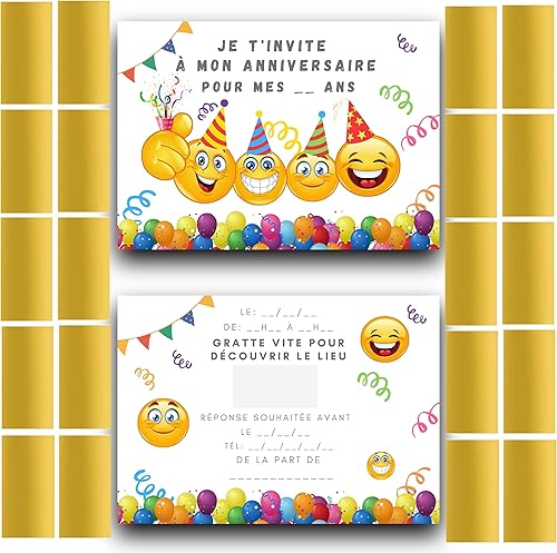 RXLITE Nouveauté 2024: Invitez avec Magie grâce aux 20 Cartes Anniversaire premium sur le thème Smiley EMOJI à Gratter + Autocollants Dorés - Joie et Créativité pour votre Enfant!