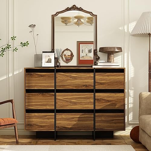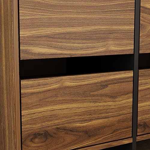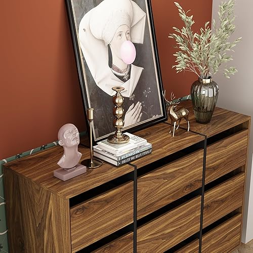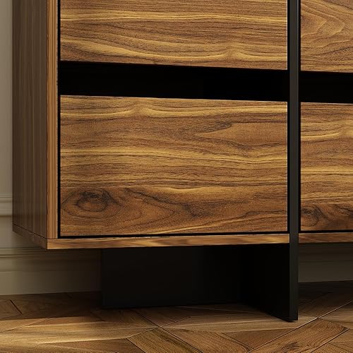 Commode Armoire de rangement 100 cm 6 tiroirs en MDF sans poignées Style industriel rustique Marron + Noir avec côtés en verre noir Convient aux petits appartements