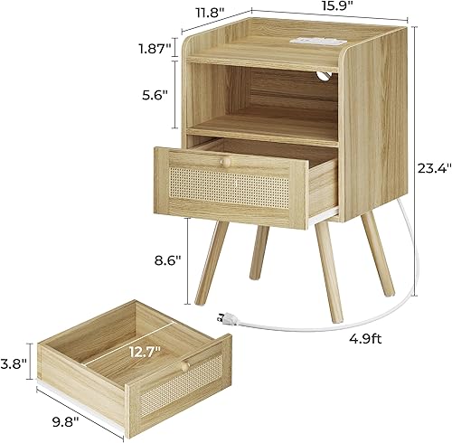 SUPERJARE Lot de 2 tables de nuit avec station de charge et tiroir décoratif en rotin PE, tables d'appoint de lit avec pieds en bois massif, table d'appoint, pour chambre à coucher, salon – Naturel