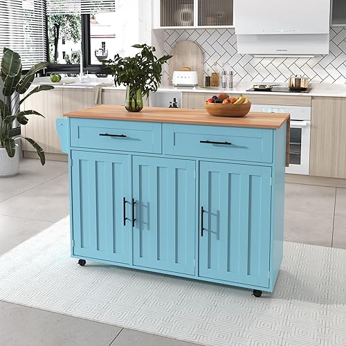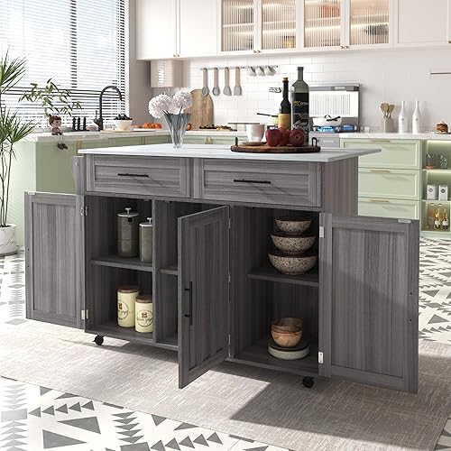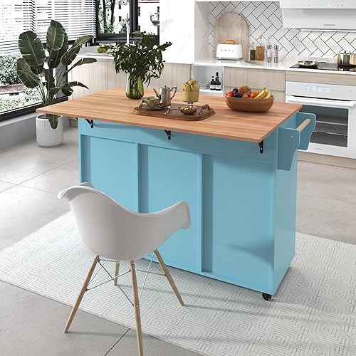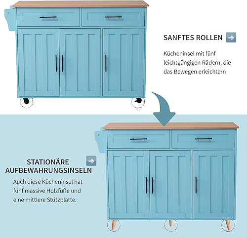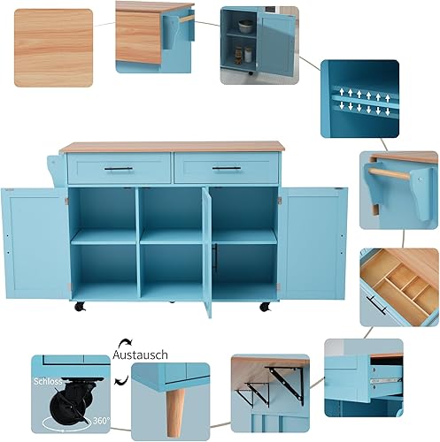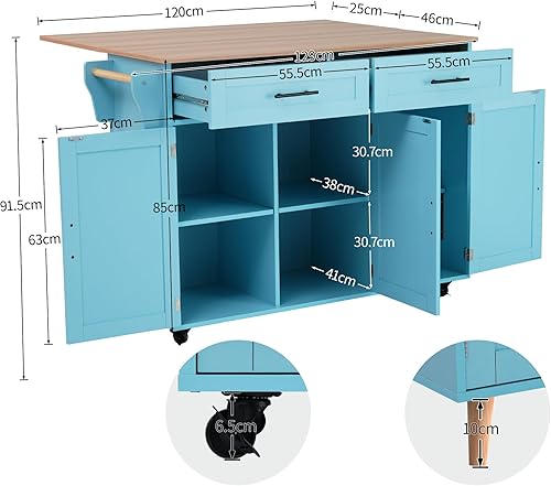 Îlot de Cuisine, Ilot Central avec Plateau Pliable, Desserte de Cuisine sur 5 Roulettes avec Armoires de Rangement et Tiroirs, étagères Réglables, Desserte de Service de Salle à Manger, Gris/Bleu