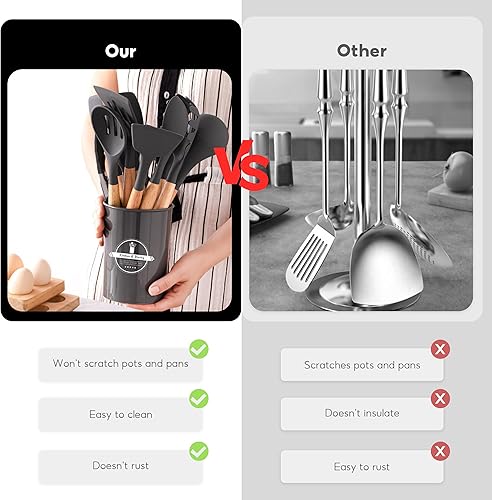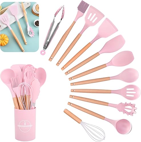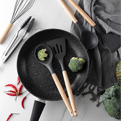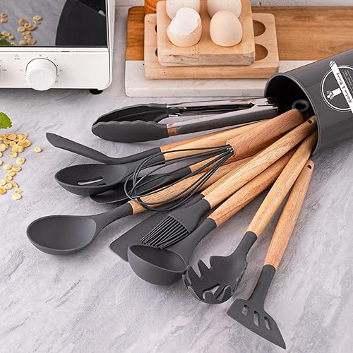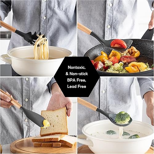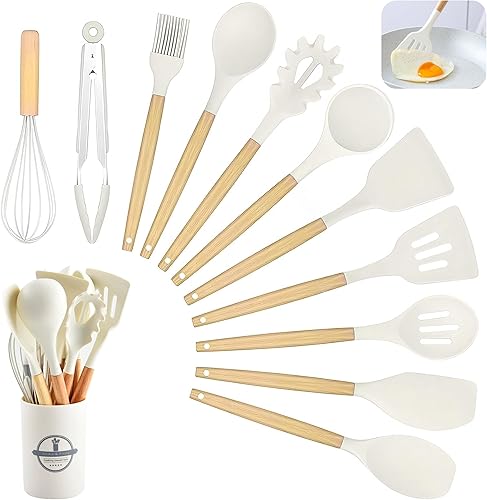 Lot de 12 ustensiles de cuisine en silicone avec poignée en bois, résistants à la chaleur, antiadhésifs, pinces, spatules et cuillères, ensemble d'ustensiles de cuisine en silicone pour cuisine (blanc