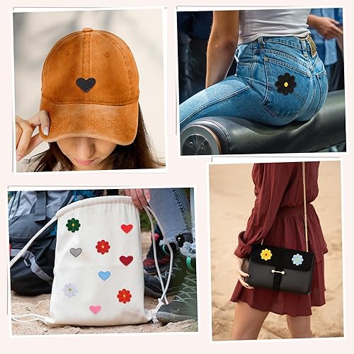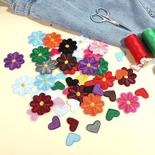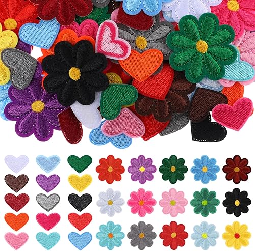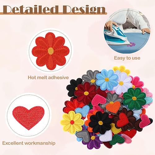 Lot de 60 écussons thermocollants à thermocoller au fer à repasser, motif fleurs et cœurs, jolis mini cœurs, marguerites, fleurs, cœurs, petits écussons brodés colorés pour vêtements, jeans, vestes