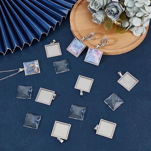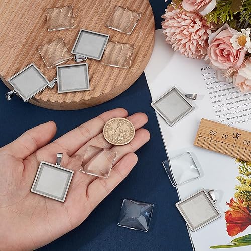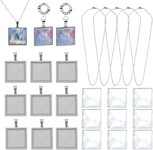 DELORIGIN Lot de 10 plateaux à pendentifs carrés de 2,5 cm, y compris 10 plateaux en acier inoxydable, 10 cabochons en verre transparent, 10 chaînes épaisses, kit de plateaux vierges pour la