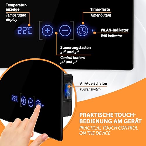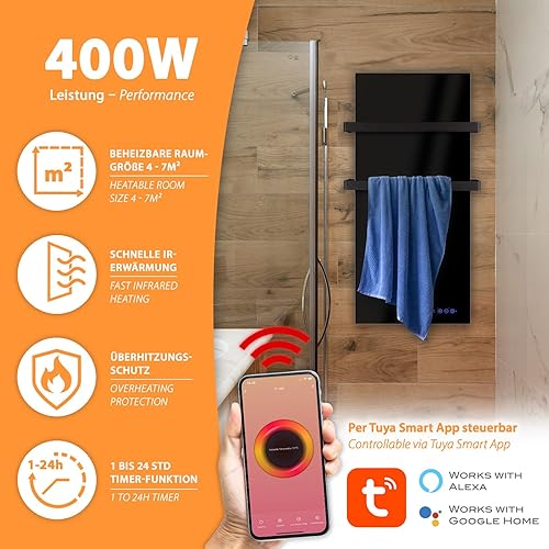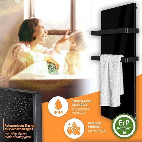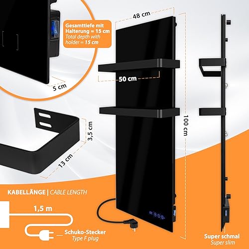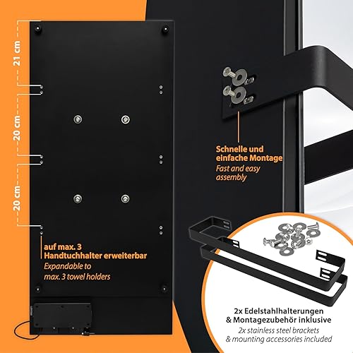 Sèche-serviettes infrarouge 48 x 100 cm - Radiateur de salle de bain avec porte-serviettes en acier inoxydable - Chauffage infrarouge - Noir