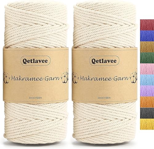 Qetlavee Lot de 2 Fils pour macramé - 3 mm x 100 m - Emballage sans Plastique - Cordon en Coton - pour Bricolage et Tricot (Naturel)