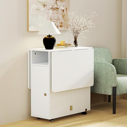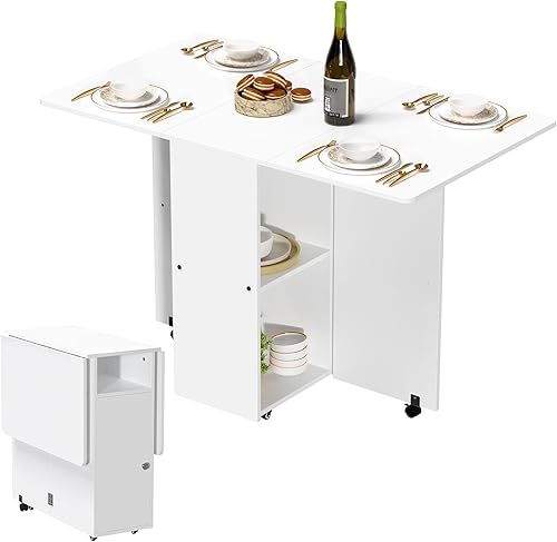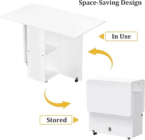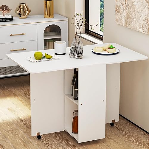 Table de Cuisine Pliante sur Roulette, Table Pliante Console, Table à Manger Pliable, Table Pliante Cuisine,Table Console Extensible avec 2 étagères, pour Petits espaces (Blanc-A)