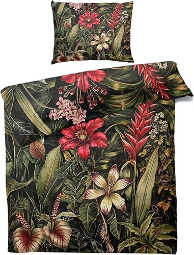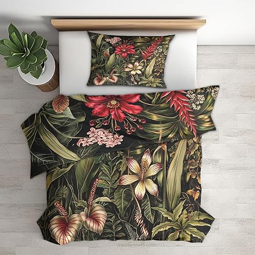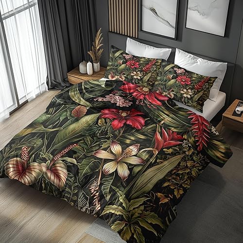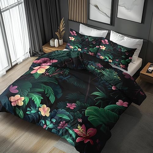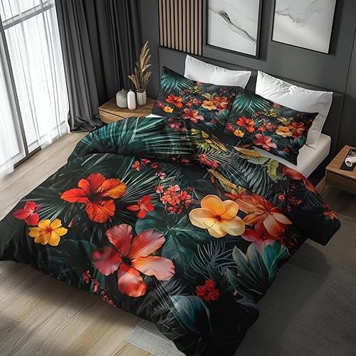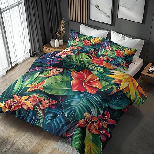 Générique Housse de Couette Fleur Tropical 220x240, Parure de Lit Motif Feuille Palmier Hibiscus Hawaii 2 Personnes - Decoration - 2 Taies d'oreiller 65x65, Fermeture Éclair, Microfibre - PKA6022