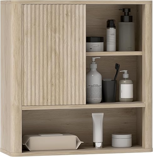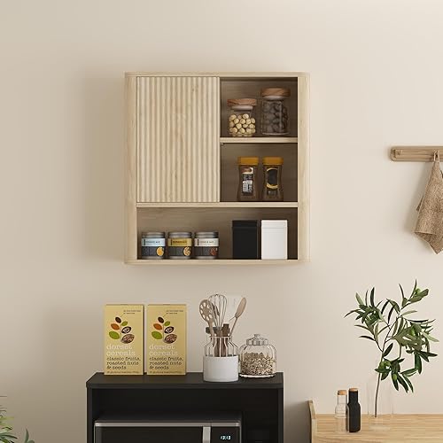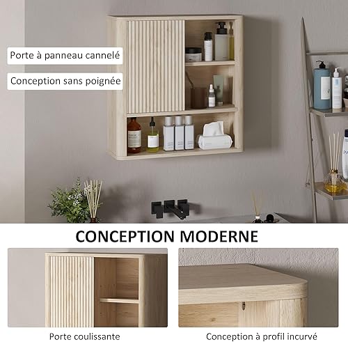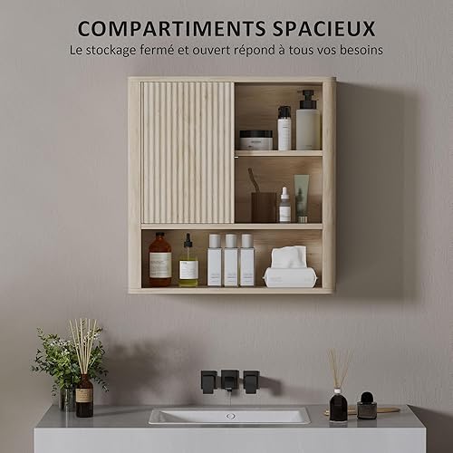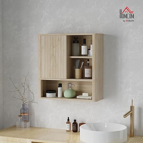 HOMCOM Armoire Murale, Meuble Haut Salle de Bain avec étagères réglables, Porte coulissante et étagères Ouvertes, Meuble de Salle de Bain, Meuble de Rangement Suspendu, 60 x 20 x 62 cm, Bois Naturel