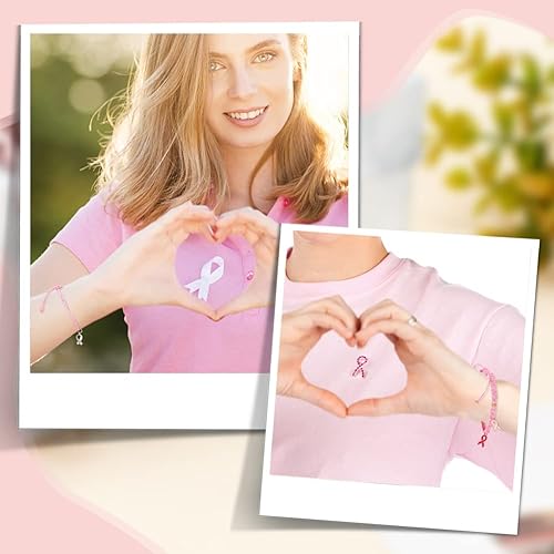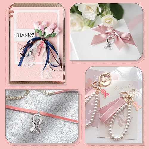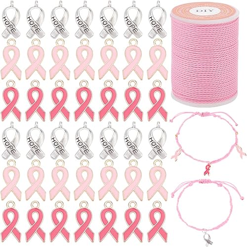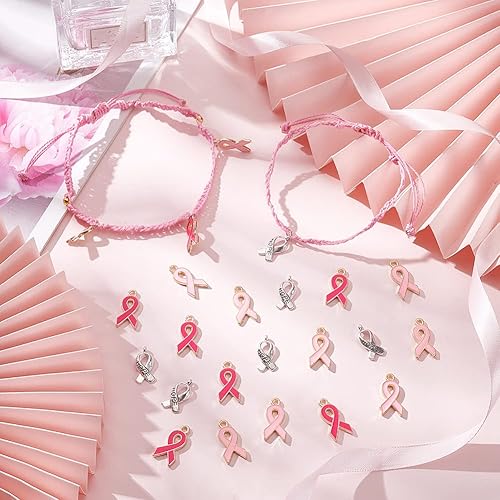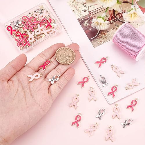 PH PandaHall 60pcs Breloques de Sensibilisation au Cancer du Sein, Pendentifs Ruban Rose et Argent Émail Sensibilisation Breloques avec Cordon Ciré Alliage Espoir Pendentifs pour Bracelet Collier