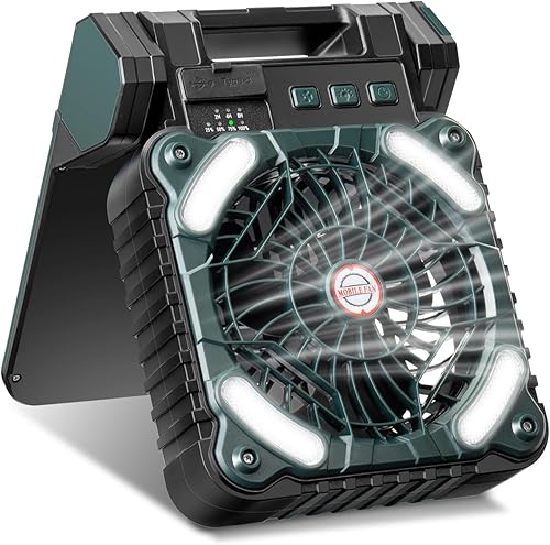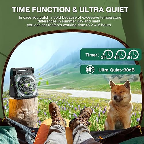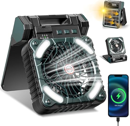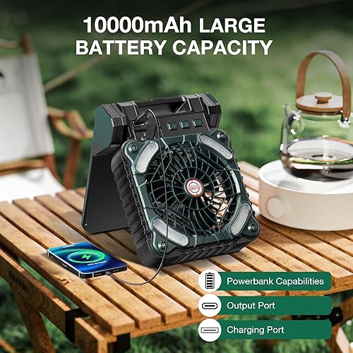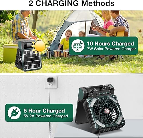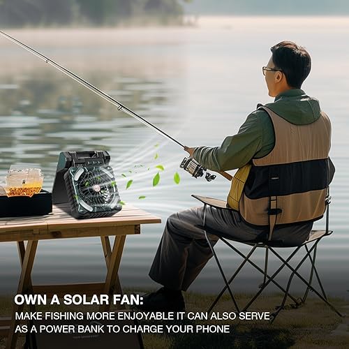 Ventilateur solaire d'extérieur avec batterie de 10 000 mAh - Avec lumière LED - 4 vitesses - Ventilateur de table portable - Silencieux - Minuterie - Rechargeable - Pour camping, voyage, pêche