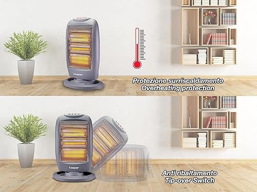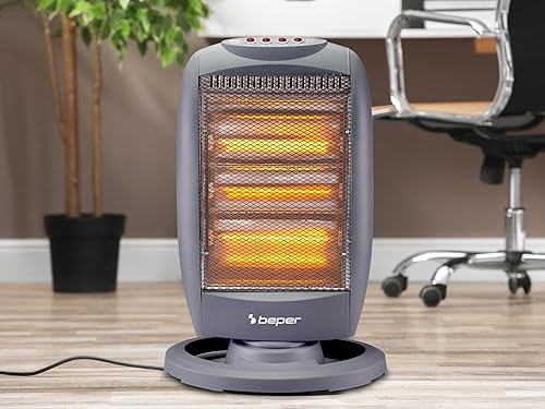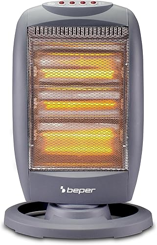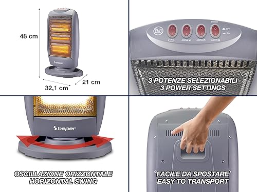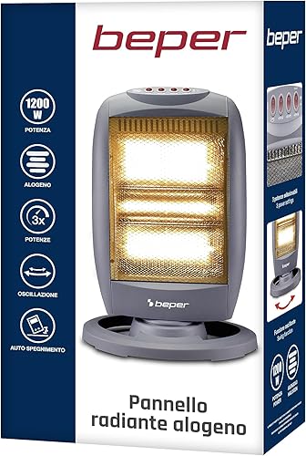 BEPER P203PAN011 Panneau radiant halogène, 400/800/1200W, 3 Eléments chauffants, 3 Niveaux de puissance, Oscillation horizontale automatique, Fonction ECO et Arrêt automatique, Gris