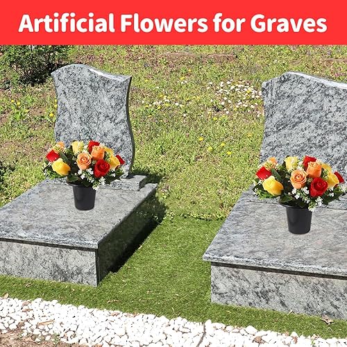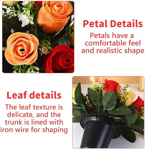 Hojalis Lot de 2 fleurs artificielles pour tombes funéraires en pot - 12 têtes de roses funéraires - Pots de 25 cm avec rose artificielle - Fleurs tombales pour cimetière, commémoration, décorations