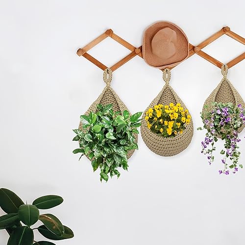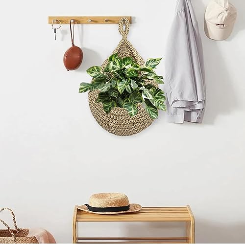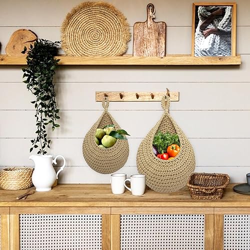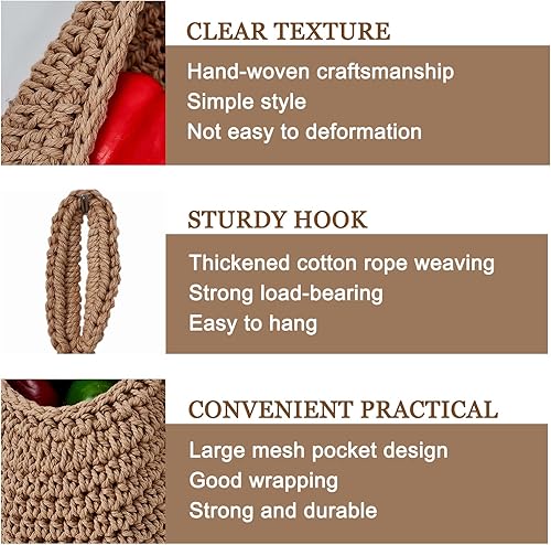 3 Pièces Panier Suspendu Rangement Cuisine, Corbeille à Fruits Suspendue, Panier Mural Fait Main Tressée avec Crochets, Organisateur de Cuisine Murale, Corbeille Tissé pour Fruits, Légumes (Brun)
