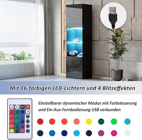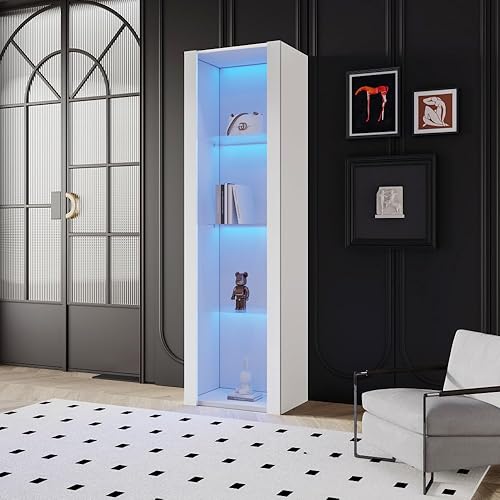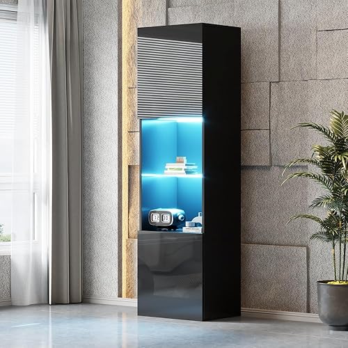 Zepneiy Vitrine Haute Brillance 55×38×166cm, Meuble de Rangement avec éclairage LED, avec 3 Compartiments en Verre, Meuble Vertical, Meuble Haut, Noir