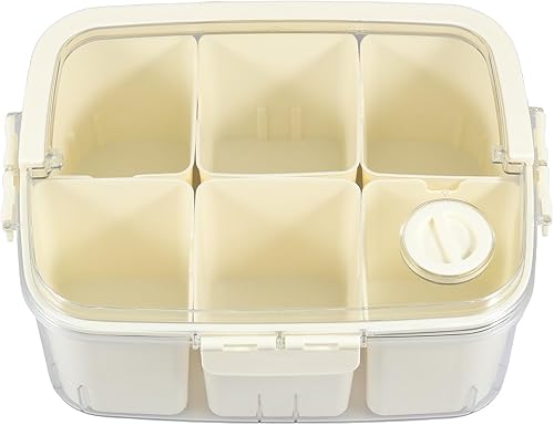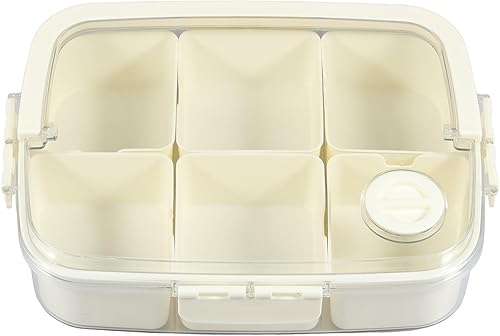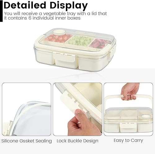 JTNero Divide Serving Plateau à collation avec couvercle et poignée 6 compartiments Transparent Boîte à collation avec marqueur de date Boîte à collation portable pour bonbons, fruits, légumes, noix,