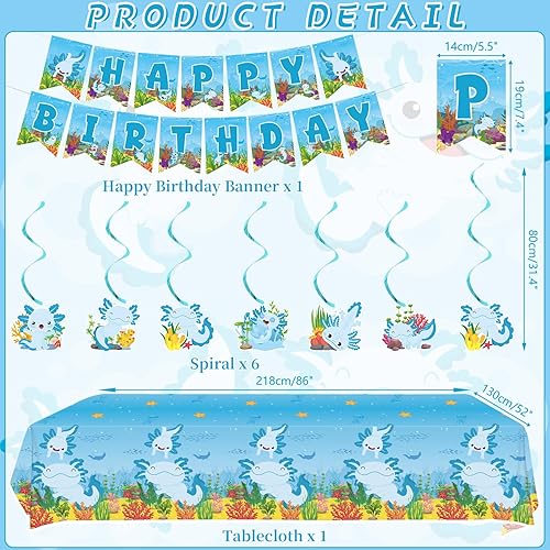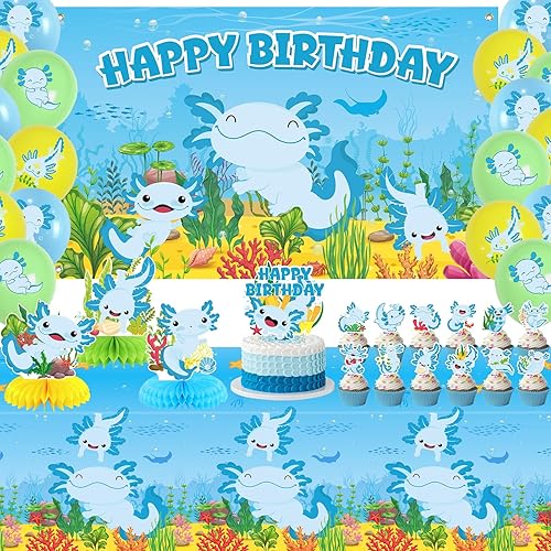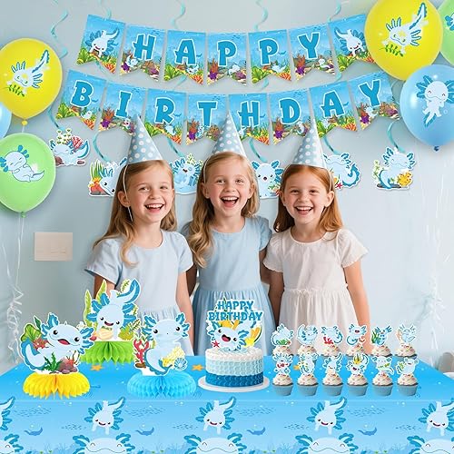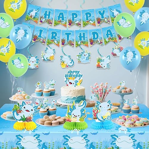 Obussgar Axolotl Décoration de fête d'anniversaire Bleu – Accessoires de fête Axolotl y compris bannière Happy Birthday, spirales, décorations de gâteau, centres de table, ballons (LQ)