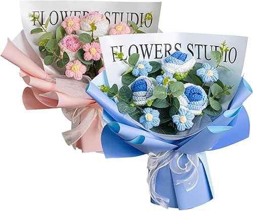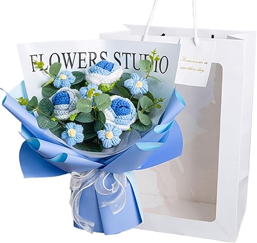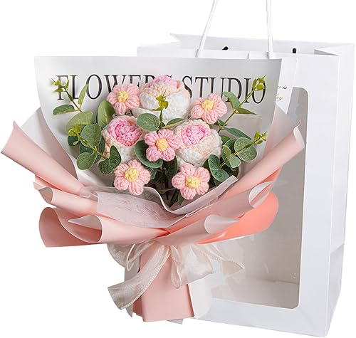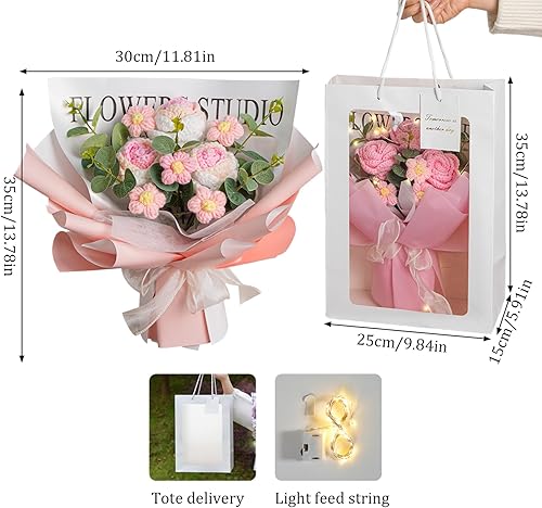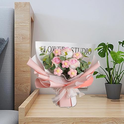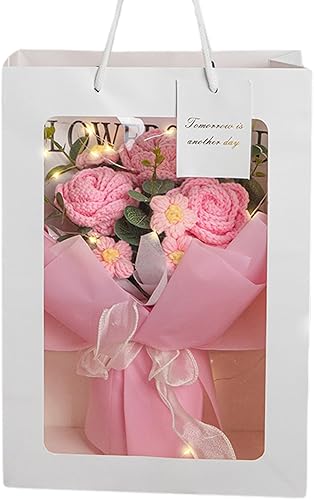 Bouquet de fleurs de crochet avec des roses légères et tricotées artificielles, bouquet en peluche bouquet de fleurs de crochet 11,8x13,8 Bouquet de roses crochet avec nœud papillon pour la fête des
