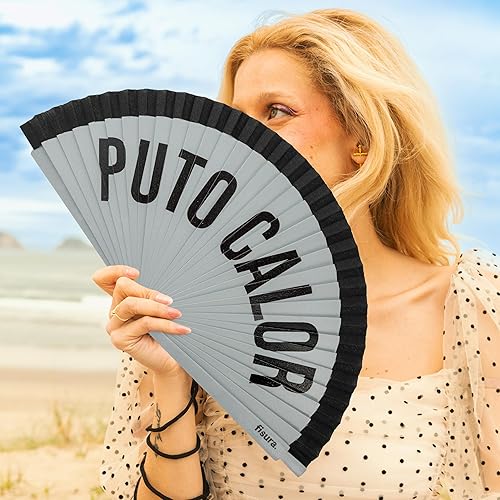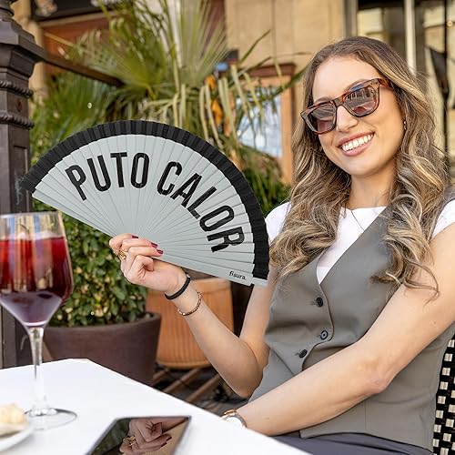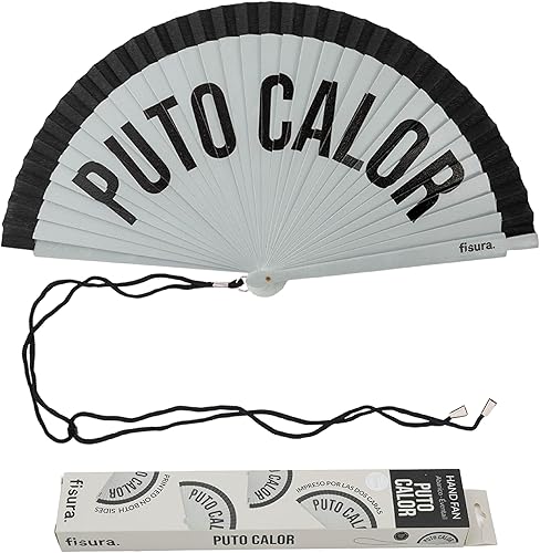 Fisura – Éventail original avec message « P*to calor ». Accessoire bois réversible élégant et coloré. Ventilateur main gris noir tendance. Crochet inclus. Taille : 42,5 x 23 cm