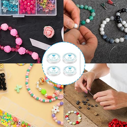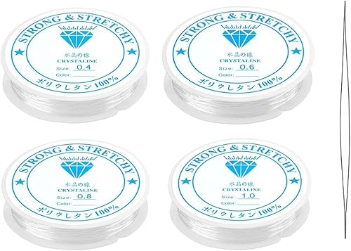 Fil Elastique pour Bracelet Resistant, 4 Rouleaux Fil pour Bracelet Perle Transparent, Fil pour Bracelet 0.4mm,0.6mm, 0.8mm, 1mm, avec et Aiguille à Perles pour Fabrication de Bijoux