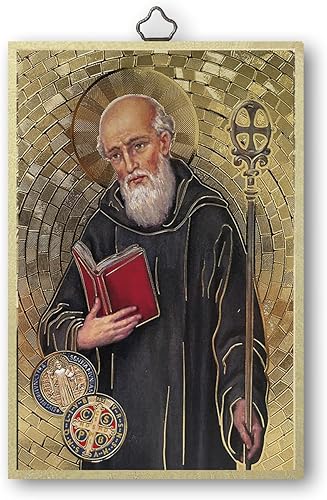 Fratelli Bonella | Tableau sacré sur bois MDF de peuplier 8 mm avec mosaïque en feuille dorée de San Benoît avec prière sur le dos 10 x 15 cm | Fabriqué en Italie