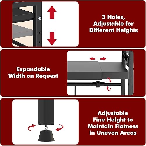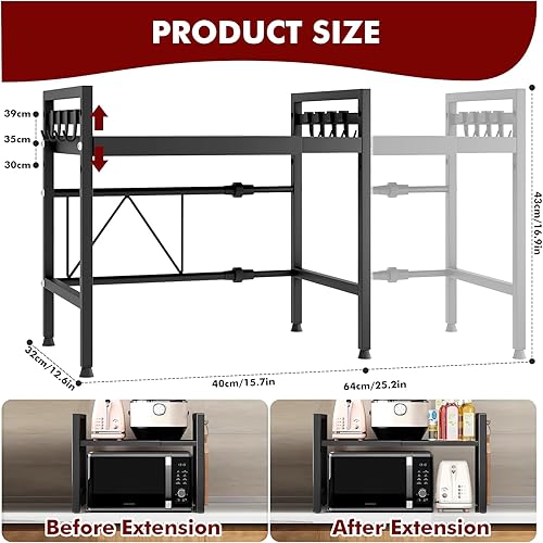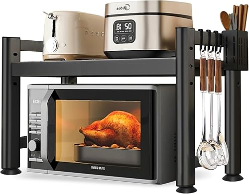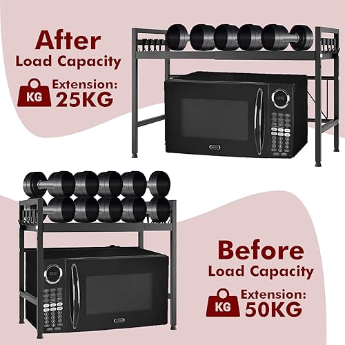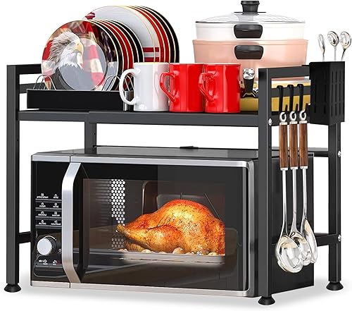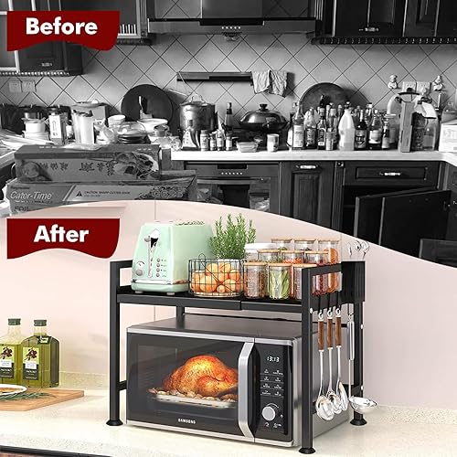 YSWOVUO Etagere Cuisine Extensible, Etagere Micro Onde avec 6 Crochets, 1 Organisateur de Baguette, Support Micro Onde en Acier au Carbone, Etagere Micro Ondes Cuisine Rangement Noir