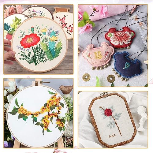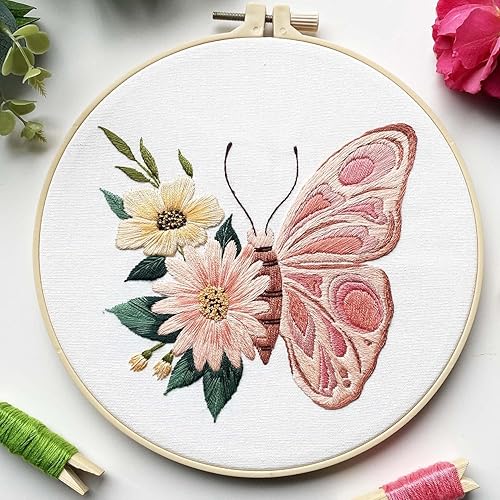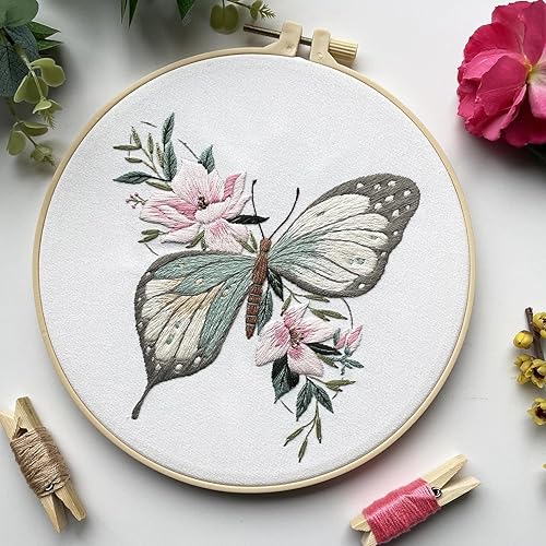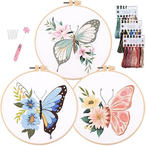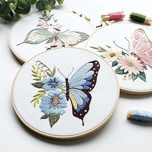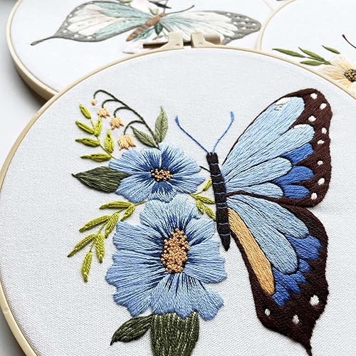 isasaka Kit de broderie pour débutants pour adultes et débutants, comprend 3 tissus à motif floral, 3 cercles à broder, du fil à broder, des fils colorés, des outils (papillon-2)