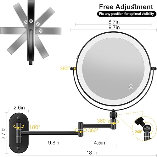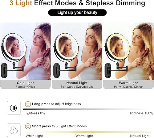IMIKONA Miroir de maquillage mural lumineux de 22,9 cm, 4 000 mAh rechargeable, double face, miroir grossissant 1x/10x avec lumière, 3 lumières de couleur, intensité tactile, bras étendu et rotation à
