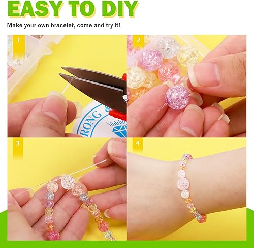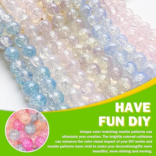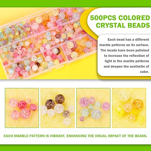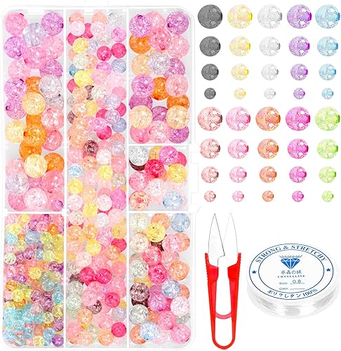 Keadic Lot de 502 perles rondes colorées en cristal acrylique avec cordon élastique et cutter, 6 mm, 8 mm, 10 mm, 12 mm, perles rondes en verre craquelé pour la fabrication de bijoux, bagues,