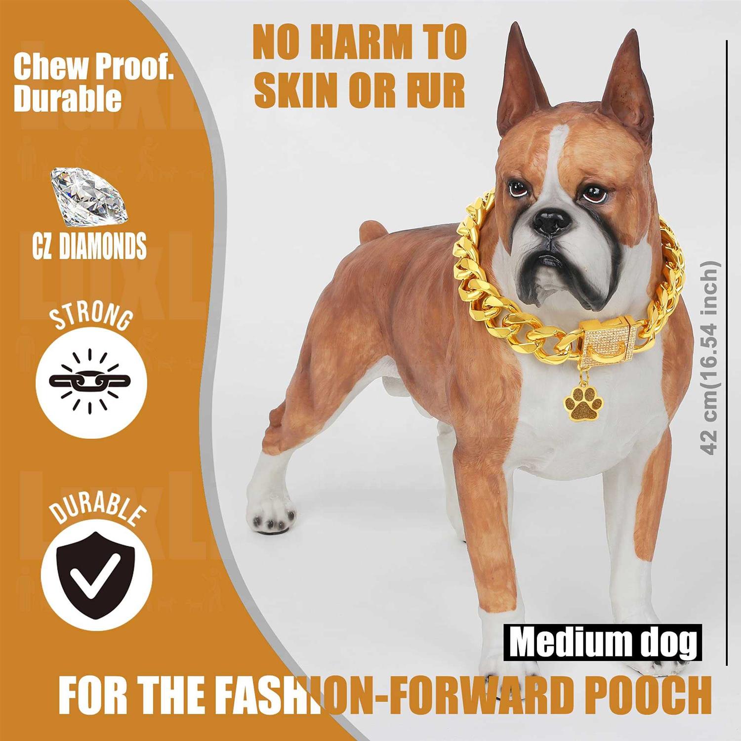 LuxLife Dog Chain Collar Designer Luxury Dog Collar Gold with CZ Buckle 19mm Cuban Link Dog Chain Metal Dog Collars for Puppy Small Medium Large