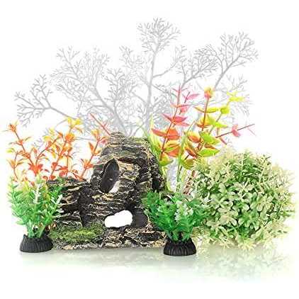 JIH Aquarium Fish Tank ,Plastic , Decorations Decor Set 7 Pieces, Small and Large Artificial Fish Tank Plants with Cave Rock